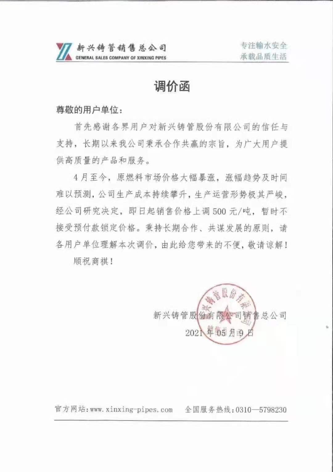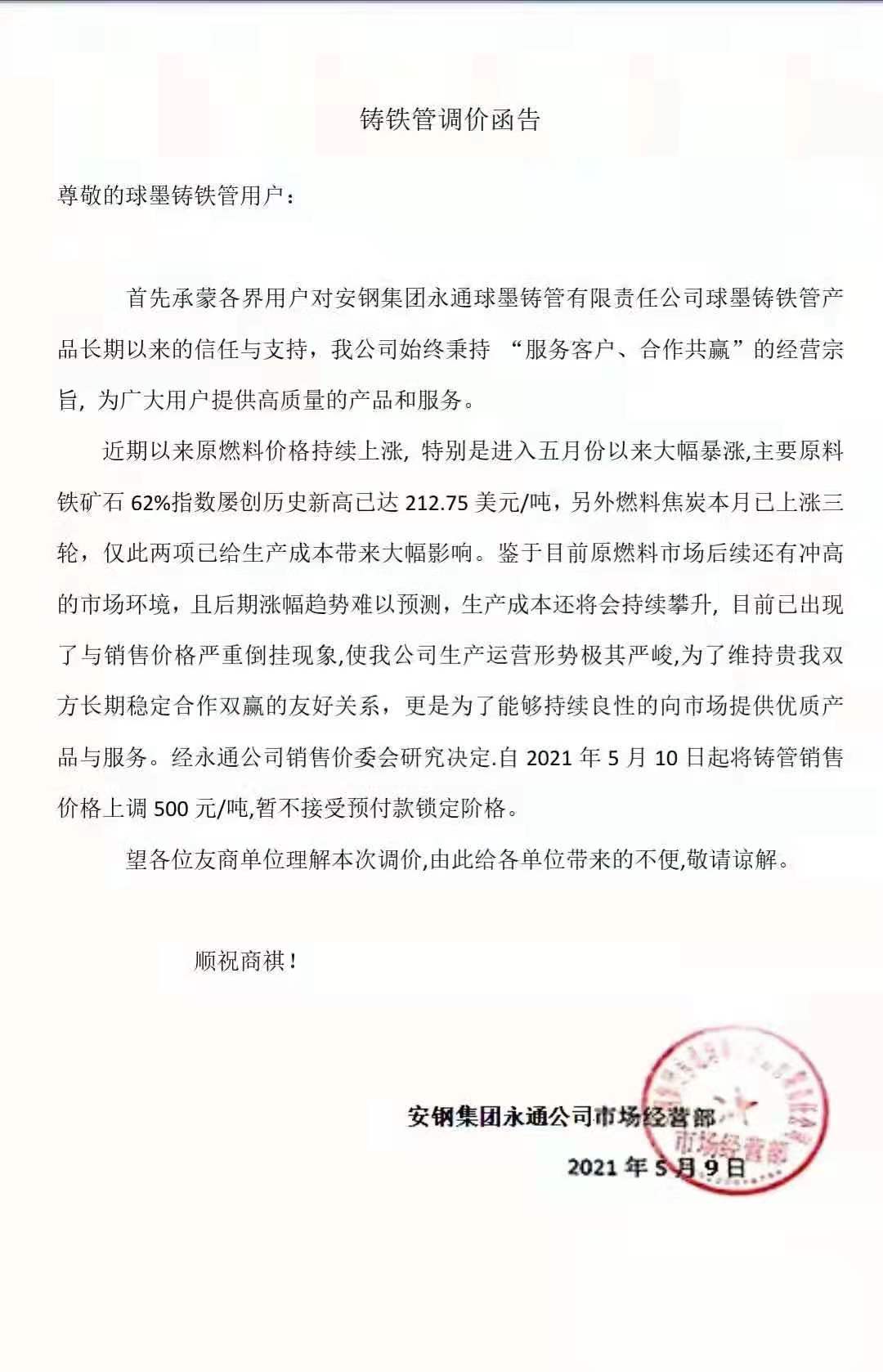 受國際鐵礦石價格創(chuàng)下歷史新高影響,國內(nèi)鋼材市場價格大幅度上漲,球墨鑄鐵管生產(chǎn)企業(yè)迫于成本壓力再次大幅度調(diào)整價格。預(yù)期價格仍將走高。