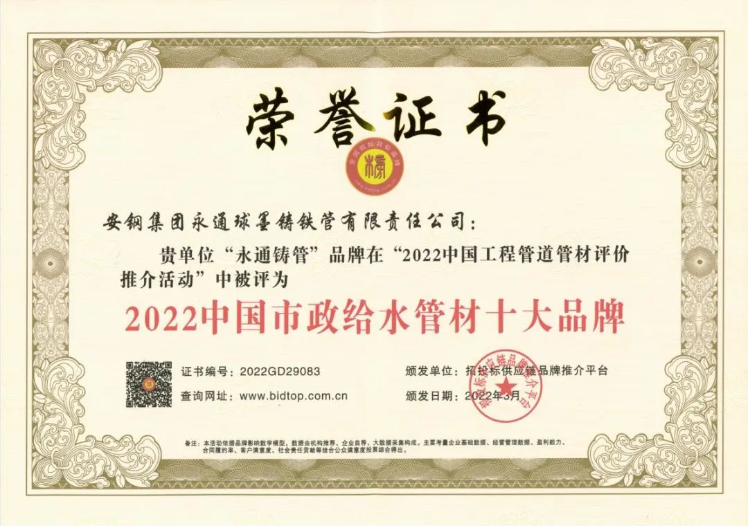 作為管道管材行業(yè)內(nèi)權(quán)威性和影響力巨大的評價推介活動,本次活動的舉辦及相關(guān)榜單的揭曉備受關(guān)注。安鋼集團(tuán)永通球墨鑄鐵管有限責(zé)任公司憑借強大的綜合實力斬獲“2022中國市政給水管材十大品牌”、“2022政府采購工程管材十大品牌”兩個重量級獎項。